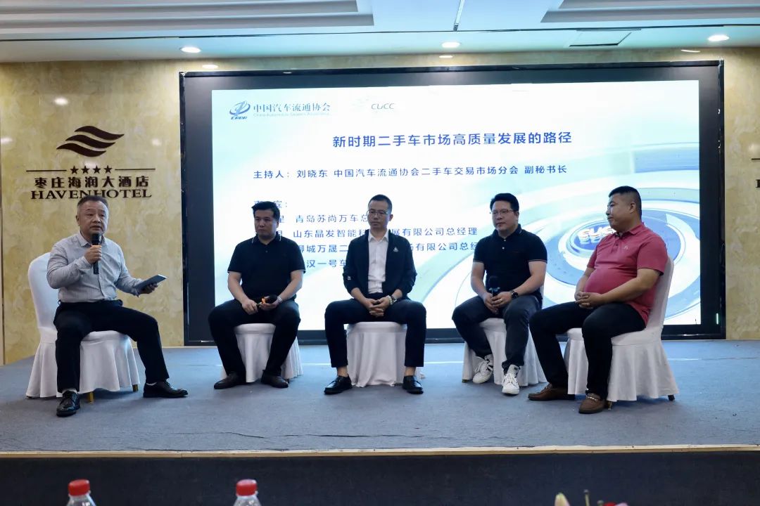 在第一个互动环节,由中国汽车流通协会二手车交易市场分会副秘书长刘晓东主持,青岛苏尚万车总经理陶文星、山东晶发智能科技发展有限公司总经理刘银、聊城万晟二手车交易市场有限公司总经理郭志龙、武汉一号车市总经理万宏亮参与,围绕“新时期二手车市场高质量发展的路径”话题展开精彩讨论。嘉宾们各抒己见,对二手车市场发展建设提供了丰富的思路。