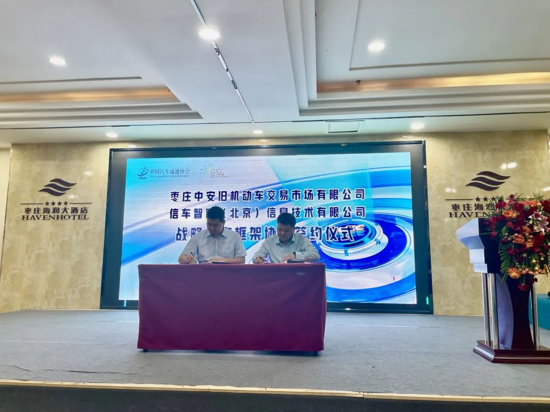 随后,在所有参会嘉宾的见证下,枣庄中安二手车交易市场与信车智联(北京)信息技术有限公司签署了战略合作。中安二手车市场总经理尹涛和信车智联CEO柴海峰出席了签约仪式。