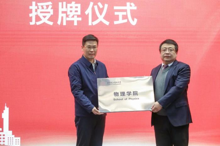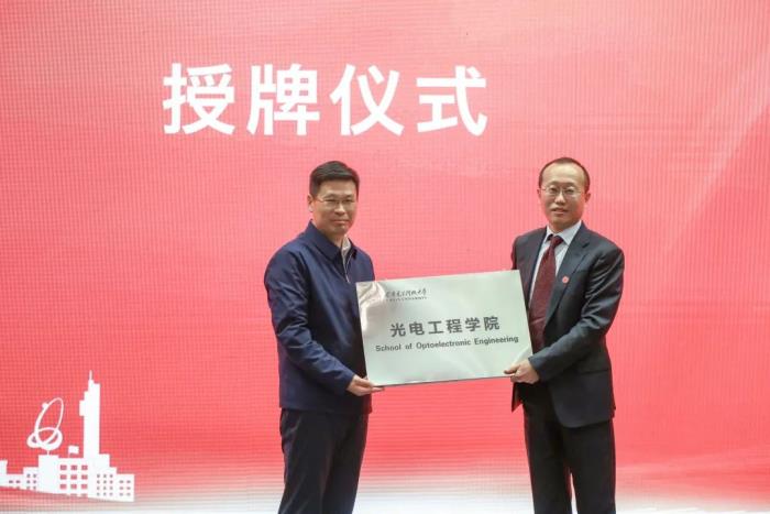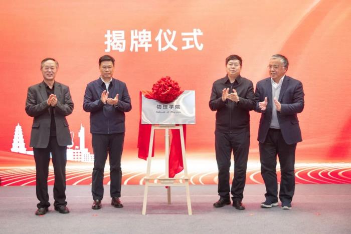党委书记查显友与赵怀斌、袁宁、马彩文共同为物理学院、光电工程学院揭牌,并向新学院的院长正式授牌。