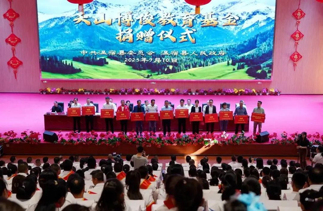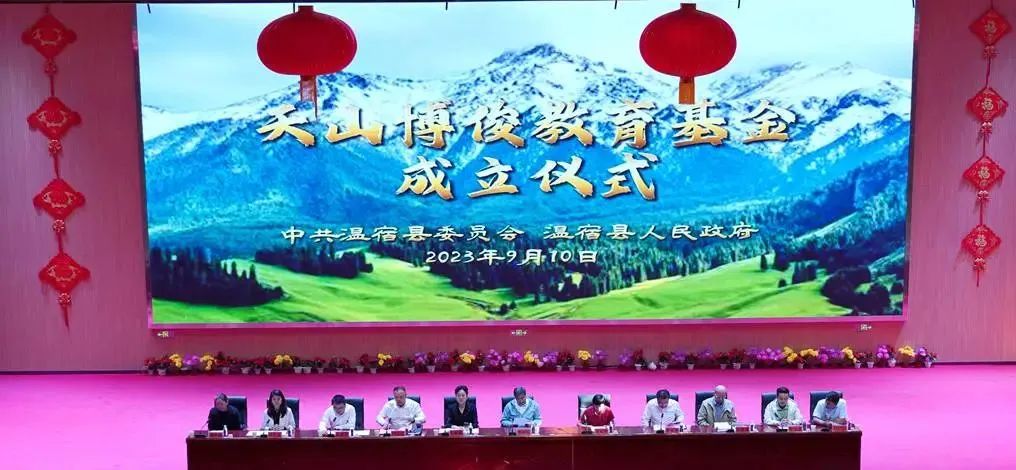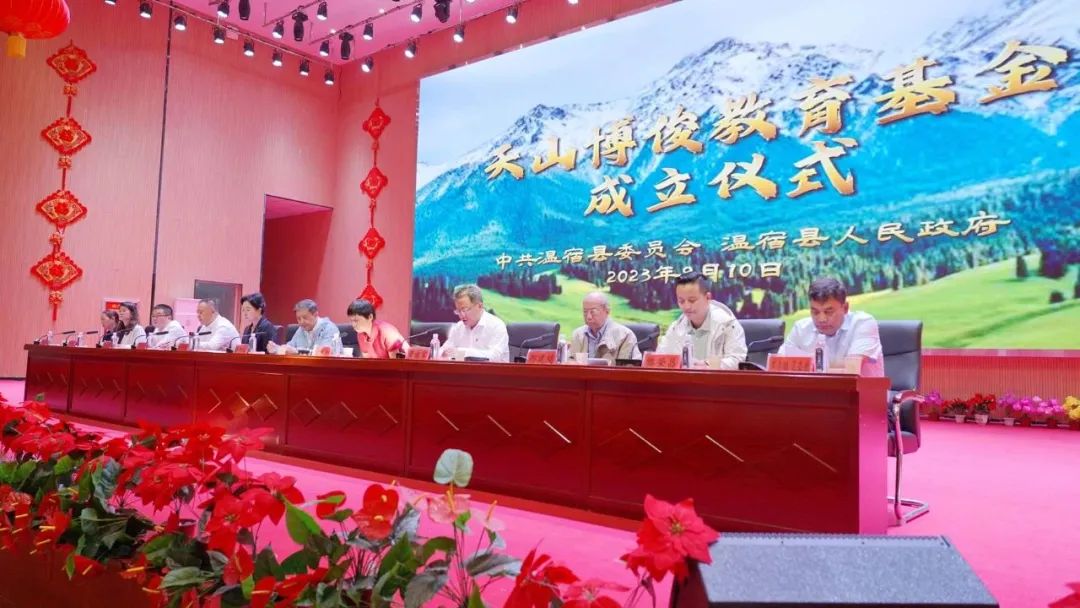 9月10日,中国少年儿童文化艺术基金会(以下简称“中国儿艺会”)“艺教工程”天山博俊教育基金成立仪式在新疆温宿县隆重举行,阿克苏地区行署副专员王新春,毛泽民同志外孙、湖南红色记忆文化基金会理事长曹耘山,曹耘山同志夫人、原总参谋部军医唐双河,全国人大代表、温宿县第七中学名誉校长库尔班·尼亚孜,中国儿艺会副会长邢建绪,中国儿艺会“艺教工程”项目管理负责人樊荣昌,北京师范大学新闻传播学院党委副书记祁雪晶,朱庭俊老师亲属王占青、喇永全、祁元寿出席成立仪式。