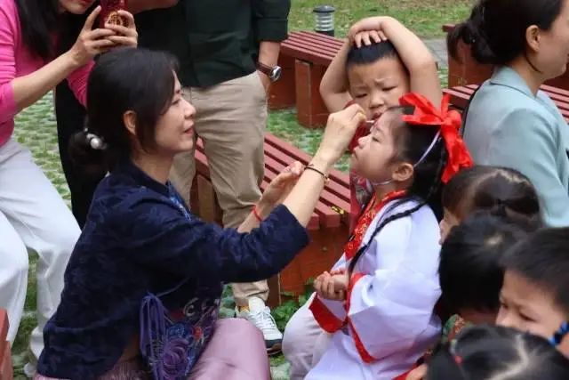 然后是正衣冠、点朱砂。正衣冠、明事理,这是孩子们知书明理的第一步骤。朱砂开智,即是在孩子额头中间点上朱砂,寓意着孩子从此眼明心明。