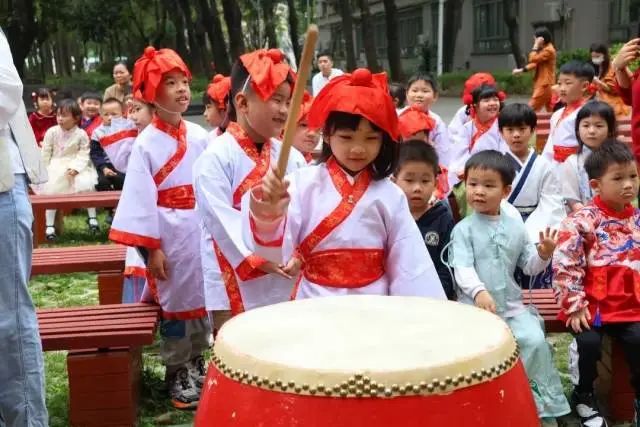 最后是击鼓明智、开笔启蒙。击鼓明智让孩子目明耳聪、茅塞顿开、未来创业建功。开笔启蒙由老师教幼儿写“人”字,一撇代表品格,一捺代表学识,期许幼儿做一个顶天立地的人。