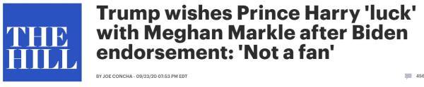 据美国《国会山报》报道,当天的记者会上,有记者提问称,“哈里王子和梅根·马克尔就美国大选表达了(他们的)看法,并鼓励民众投票给乔·拜登。我想知道您对此作何反应。”