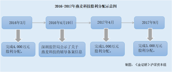 值得关注的是,2016年4月19日,深圳证监局公示了国金证券股份有限公司关于燕麦科技的辅导备案信息。而在此前的2016年3月,燕麦科技完成股利分配4,000万元,在此后的2017年其连续进行了两次股利分配,分别于2017年4月以及2017年9月完成。