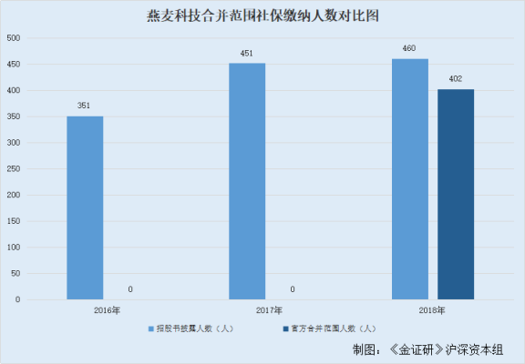 据招股书注册稿,2016-2018年,燕麦科技合并范围的社保缴纳人数分别为351人、451人、460人。