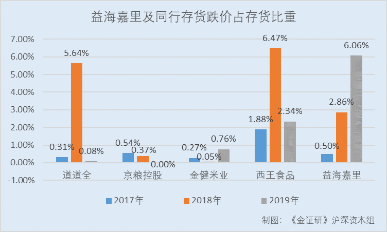 对比同行业上市公司,据同花顺iFinD数据,2018-2019年,道道全粮油股份有限公司(以下简称“道道全”)的存货跌价损失同比增速分别为1,429.36%、-97.59%;金健米业股份有限公司(以下简称“金健米业”)的存货跌价损失同比增速分别为-78.70、1,393.06%;西王食品股份有限公司(以下简称“西王食品”)的存货跌价损失同比增速分别为117.35%、-58.41%;海南京粮控股股份有限公司(以下简称“京粮控股”)的存货跌价损失同比增速分别为-40.16%、-99.27%%。2017及2019年,克明面业股份有限公司(以下简称“克明面业”)的存货跌价损失分别为3.86万元、155.87万元,2018年克明面业并无存货跌价损失。