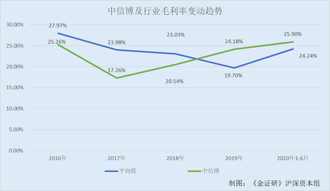 2016-2019年以及2020年1-6月,上述三家同行业可比公司销售毛利率的平均值分别为27.97%、23.98%、23.03%、19.7%、24.24%。
