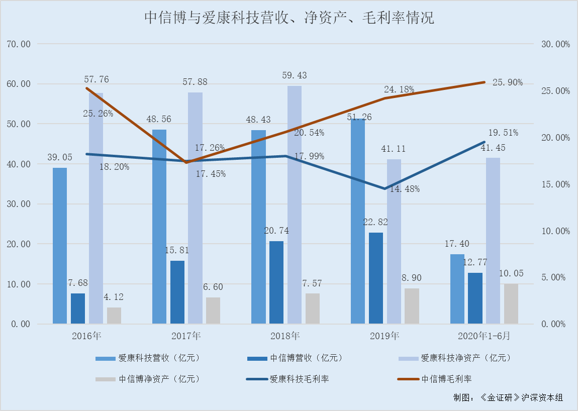 值得一提的是,2016-2019年以及2020年1-6月,爱康科技的营业收入及净资产规模均高于中信博,而同期,爱康科技的销售毛利率却均低于中信博。