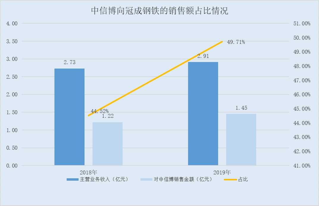 不仅如此,2018-2019年,冠成钢铁对中信博的销售金额,占同期冠成钢铁营业总收入的比例分别为44.52%、49.71%。