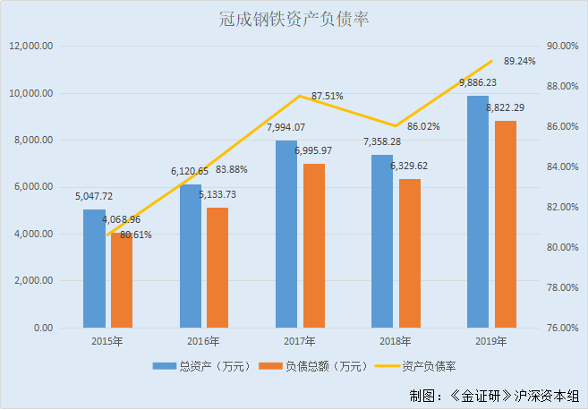 由此上述资产总额及负债总额的数据计算可得,2015-2019年,冠成钢铁的资产负债率分别为80.61%、83.88%、87.51%、86.02%、89.24%。