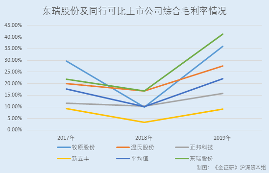2017-2019年,东瑞股份同行业可比公司的平均综合毛利率分别为17.71%、10.07%、22.09%。