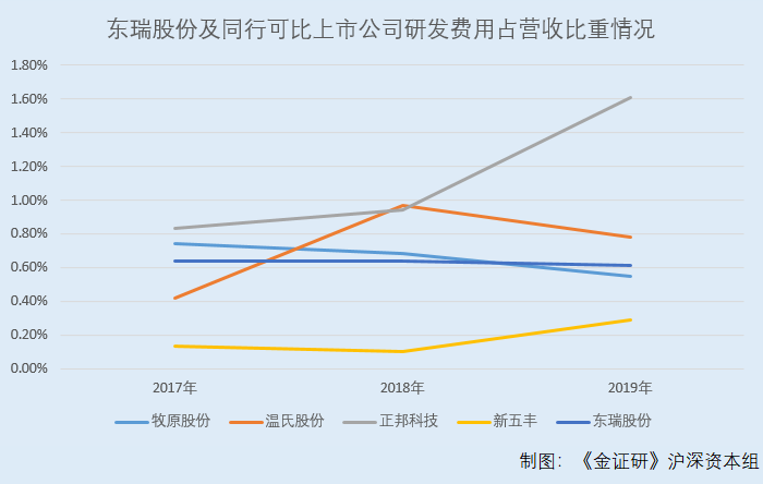 没有对比,便没有伤害。截至2019年12月31日,东瑞股份研发人员为29人,占比为4.38%。2017-2019年,东瑞股份研发费用分别为406.46万元、394.73万元、530.32万元,研发费用占营业收入的比重分别为0.64%、0.64%、0.61%。