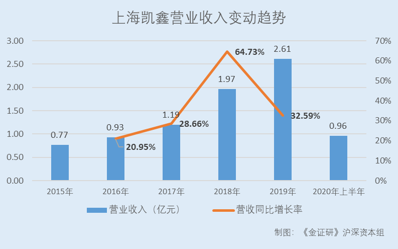 2015-2019年及2020年上半年,上海凯鑫的营业收入分别为0.77亿元、0.93亿元、1.19亿元、1.97亿元、2.61亿元、0.96亿元,2016-2019年分别同比增长20.95%、28.66%、64.73%、32.59%。