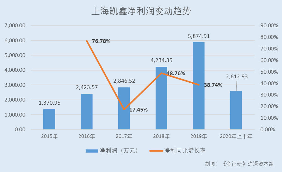 2015-2019年及2020年上半年,上海凯鑫的净利润分别为1,370.95万元、2,423.57万元、2,846.52万元、4,234.35万元、5,874.91万元、2,612.93万元,2016-2019年分别同比增长76.78%、17.45%、48.76%、38.74%。