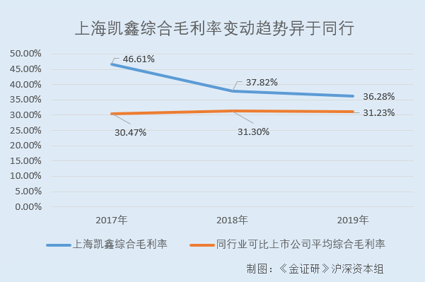 2017-2019年,上海凯鑫的综合毛利率分别为46.61%、37.82%、36.28%。