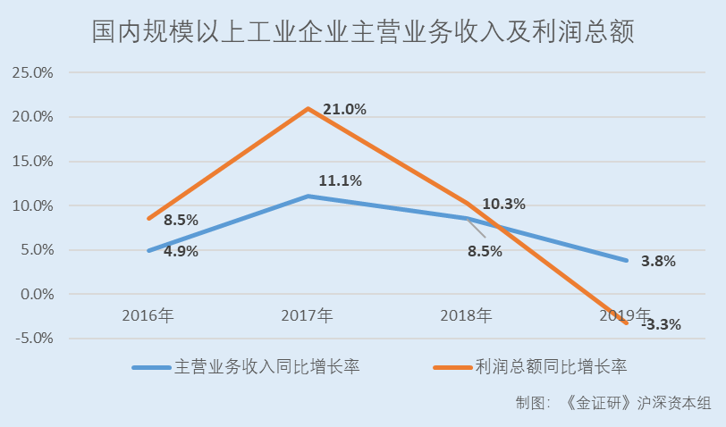 可见,近年来,国内规模以上工业企业的主营业务收入增速放缓,2019年,利润总额呈负增长的态势。
