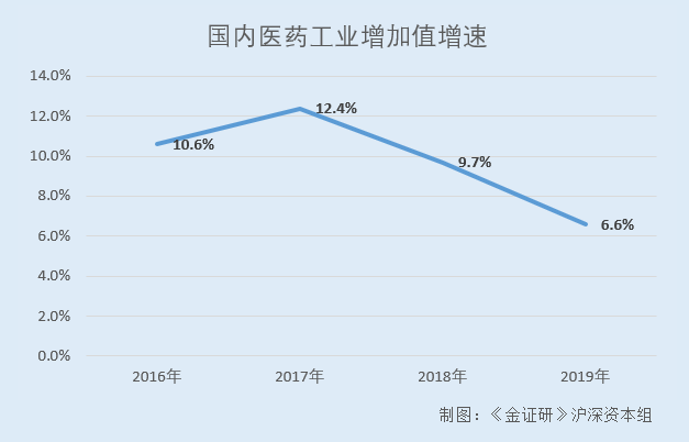 而据中国医药企业管理协会发布的《2019年中国医药工业经济运行报告》,2016-2019年,国内医药工业增加值增速分别为10.6%、12.4%、9.7%、6.6%。