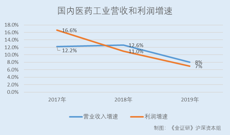 2017-2019年,国内医药工业营业收入增速分别为12.2%、12.6%、8%,利润增速分别为16.6%、11%、7%。
