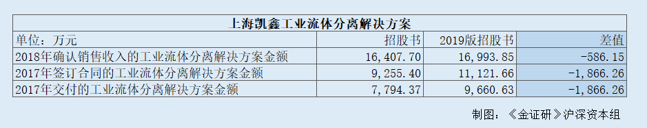 而2019版招股书显示,2017年,上海凯鑫工业流体分离解决方案签订合同的金额、交付的金额分别为11,121.66万元、9,660.63万元。