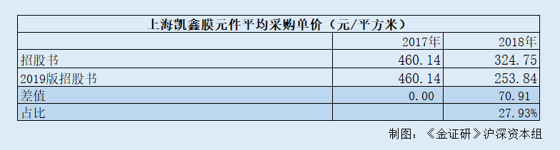 而据2019版招股书,2017-2018年,上海凯鑫膜元件的采购金额分别为4,580.14万元、7,950.75万元,平均采购单价分别为460.14元/平方米、253.84元/平方米。