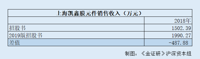 对比两版招股书,2018年,上海凯鑫膜元件的平均销售单价一致,但招股书披露的鑫膜元件销售收入却比2019版招股书的数据少了487.88万元。