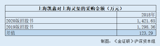 对比两版招股书,招股书披露的上海凯鑫2018年对上海灵渠的采购金额,比2019版招股书多出123.29万元。