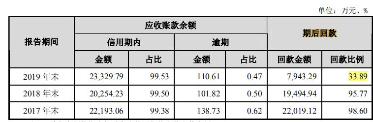 2017年末、2018年末和2019年末,澳弘电子应收账款余额分别为2.23亿元、2.04亿元和2.34亿元,占营业收入的比例分别为27.83%、24.32%和27.75%,应收账款增加。2017-2019年澳弘电子的应收账款的主要账龄在1年以内,按照账龄划分,澳弘电子1年以内的应收账款账面余额分别为2.22亿元、2.03亿元、2.33亿元,占同期营收账款账面余额的比重分别为99.38%、99.5%、99.53%。