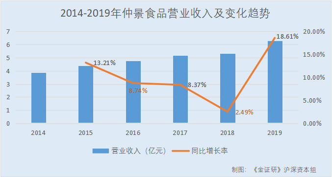 同期,仲景食品的净利润分别为7,083.32万元、5,718.1万元、7,592.32万元、7,899.57万元、8,100.05万元、9,145.87万元,2015-2019年分别同比增长-19.27%、32.78%、4.05%、2.54%、12.91%。