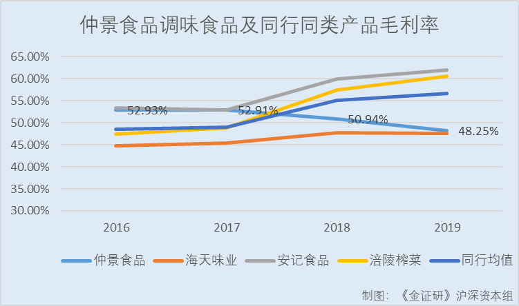 显而易见,仲景食品调味食品的毛利率变动趋势异于同行业,在逐年下降。