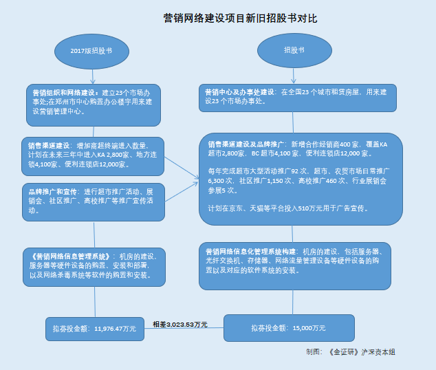 也就是,两版招股书中,名称同为“营销网络建设项目”的募投项目建设内容与效益“大同小异”,而招股书拟募资金额却由2017版招股书披露的11,976.47万元变成15,000万元,募集资金多出3,023.53万元。即仲景食品的募投项目或“换汤不换药”,募资额增加了逾3,000万元。