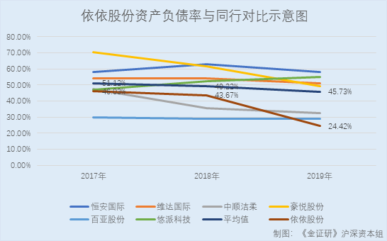 可见,2017-2019年,依依股份的资产负债率持续走低。且2019年,在上述同行业公司中,其资产负债率处于低位,与以宠物一次性卫生护理用品生产销售为主的悠派科技相比,依依股份的资产负债率并不到悠派科技的一半。