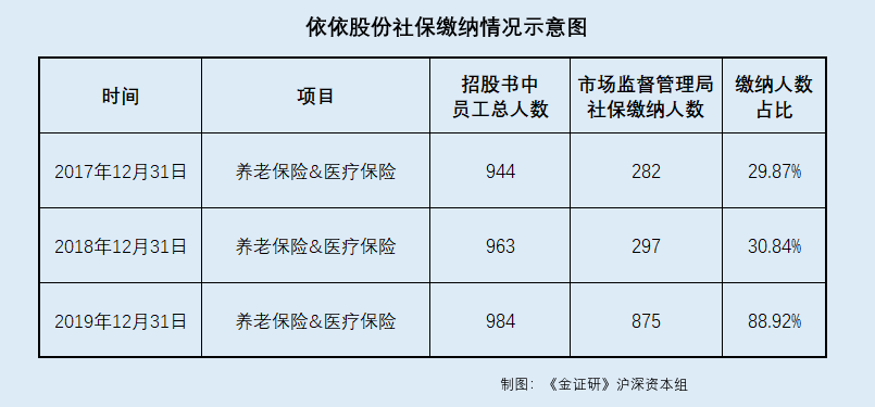 即2017-2019年,依依股份社保缴纳人数占员工人数的比例分别为29.87%、30.84%、88.92%。也就是说,2017-2018年,依依股份的社保缴纳人数占比都仅在三成左右。