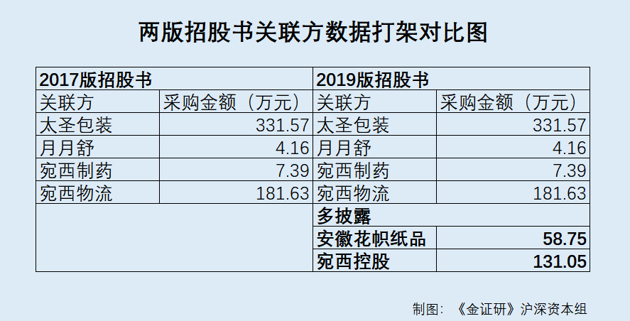 相比2017版招股书,在2019版招股书中,仲景食品多披露了安徽花帜纸品有限公司(以下简称“安徽花帜纸品”)和河南省宛西控股股份有限公司(以下简称“宛西控股”)两家关联方的采购情况。其中,仲景食品向安徽花帜纸品采购58.75万元,向宛西控股采购131.05万元,采购金额总计比2017版招股书披露的多出189.8万元。