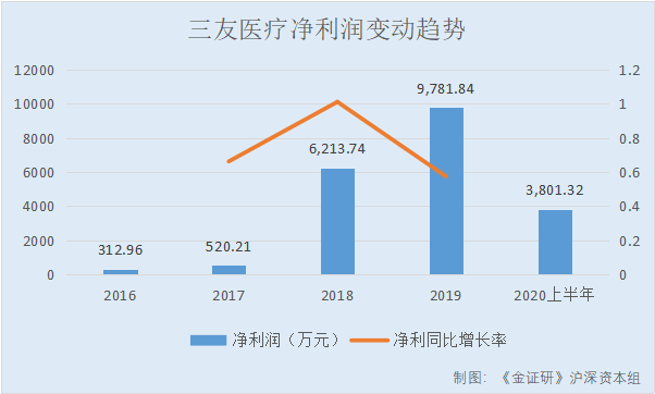 同期,三友医疗净利润分别为312.96万元、520.21万元、6,213.74万元、9,781.84万元,2017-2019年分别同比增长66.22%、101.18%、57.42%。