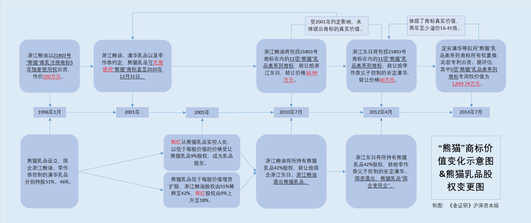 且公开转让说明书显示,上述两次评估价值,与中都国脉2014年7月20日作出的评估价值差异巨大,主要是受2001年浙江粮油与当时熊猫乳品股东澳华乳品、李作恭间的约定所影响。按浙江粮油与澳华乳品、李作恭约定,熊猫乳品可无偿使用“熊猫”商标的独家使用权,直至2020年12月31日。