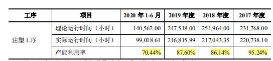 电机为公司产品的核心部件,可用于成品微电机、清洗泵、清洗系统的后续生产。2017年-2020年1-6月电机工序的产能利用率分别为96.82%、86.66%、93.90%和75.06%,下滑严重。注塑工序的产能利用率从2017年的95.24%下降到了2020年1-6月的70.44%。