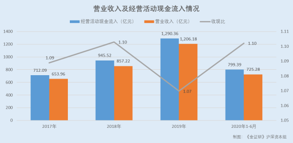 据招股书,2017-2019年以及2020年1-6月,蚂蚁集团经营活动现金流入小计分别为712.09亿元、945.52亿元、1,290.36亿元、799.39亿元,收现比分别为1.09、1.1、1.07、1.1。