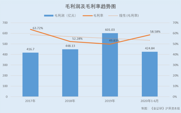 据招股书,2017-2019年以及2020年1-6月,蚂蚁集团毛利润分别为416.7亿元、448.13亿元、601.03亿元、424.84亿元,同期毛利率分别为63.72%、52.28%、49.83%、58.58%。