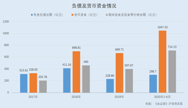 据招股书,2017-2019年以及2020年1-6月,蚂蚁集团货币资金分别为328.05亿元、698.81亿元、669.71亿元、1,047.23亿元,期末现金及现金等价物余额分别为203.78亿元、460亿元、397.67亿元、714.13亿元。