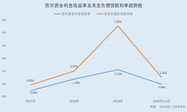 即除了2019年,2017-2018年以及2020年1-6月,蚂蚁集团货币资金利息收益率在活期存款基准利率和一年定期存款基准利率之间。由此可见,其货币资金利息收益率或偏低。