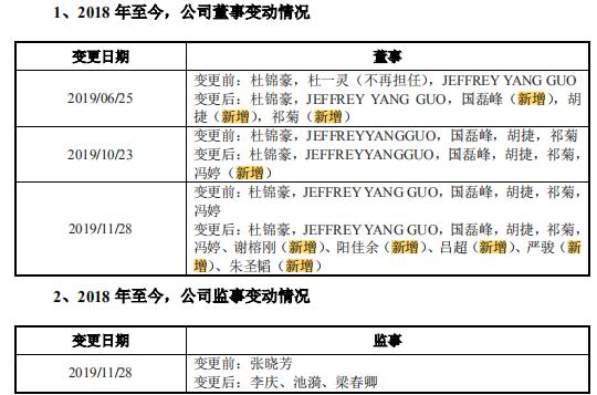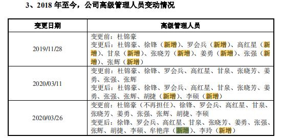 高级管理人员的变动更是引人注意,2019年11月之前,艾力斯高级管理人员只有杜锦豪一人,但是在2019年11月28日一口气新增了8名高管人员,高管人员队伍从1人扩展到9人,2020年3月11日又新增了2名高管,2020年3月26日再次新增了2名高管,同时在3月26日杜锦豪不再担任总经理,退出高管队伍,保留董事长职务。如此算来,从2019年11月到2020年3月26日,高管队伍共新增12名高管,可以说是一个全新的高管团队。