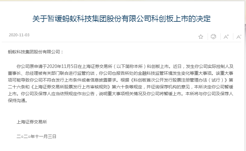 马云的蚂蚁科技原申请于2020年11月5日在上海证券交易所科创板上市,而几分钟前的一篇上交所公告,直接给马先生浇了一盘冷水: