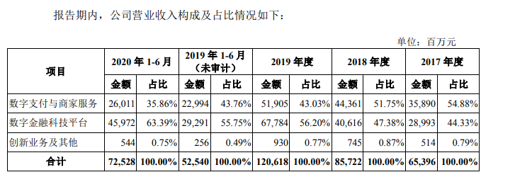蚂蚁科技与金融机构合作为公司平台上的消费者和商家创造价值。报告期内,数字金融科技平台收入在公司的收入占比不断提高。2019 年度及 2020 年 1-6 月,数字金融科技平台收入占公司总收入的比例分别达到56.20%和 63.39%,预计将成为公司未来增长的重要驱动因素。公司数字金融科技平台绝大部分收入来自向合作金融机构收取的技术服务费。
