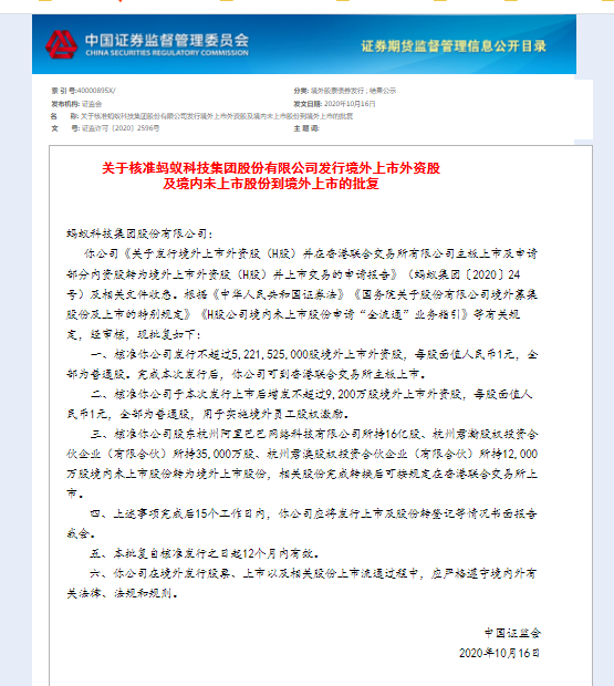 2020年10月16日,证券会发布《关于核准蚂蚁科技集团股份有限公司发行境外上市外资股及境内未上市股份到境外上市的批复》,批复蚂蚁科技境内外上市,此为喜报,全文如下: