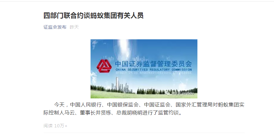 2020年11月3日,中国人民银行、中国银保监会、中国证监会、国家外汇管理局已对蚂蚁集团实际控制人马云、董事长井贤栋、总裁胡晓明进行了监管约谈。