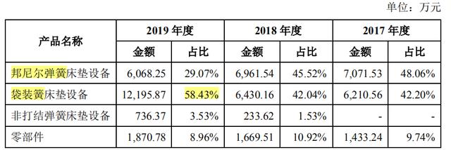 华剑智能整机产品销售以邦尼尔弹簧床垫设备和袋装簧床垫设备为主,合计销售收入占主营业务收入的比例约为90%,邦尼尔弹簧床垫设备实现收入金额分别为7,071万元、6,961万元和6,068万元,占当期主营业务收入比重分别为48.06%、45.52%和29.07%,销售规模连年下降,2019年尤其下降明显。