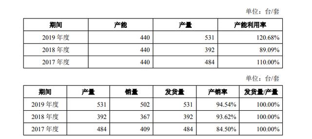 2017年-2019年华剑智能的产能均为440台/套,产量分别为484台、392台、531台;产能利用率分别为110%、89.09%、120.68%;报告期内销量分别为409台、367台、502台,产销率分别为84.5%、93.62%、94.54%。