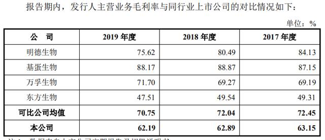报告期各期,奥泰生物综合毛利率分别为63.15%、62.89%及62.29%,其中2019年度较2018 年度下降0.60个百分点,2018年度较2017年度下降0.26个百分点。与同行业可比公司比较,奥泰生物的毛利率也低于同行。奥泰生物选取明德生物、基蛋生物、万孚生物、东方生物作为同行业可比公司,其三年平均毛利率分别为72.45%、72.04%和70.75%,均高于奥泰生物。