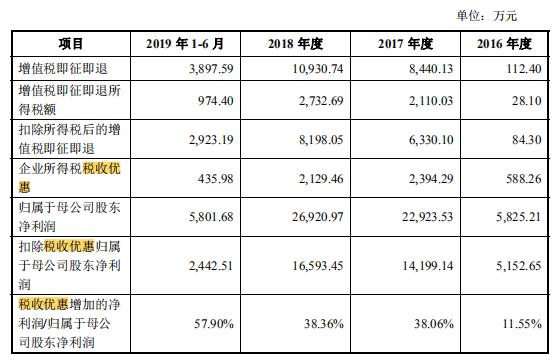 此外,森林包装享受的税收优惠主要为增值税即征即退和高新技术企业所得税优惠,税收优惠政策对公司利润影响很大。2016年-2019年1-6月,森林包装享受的税收优惠占归属于母公司股东净利润比例逐步提高,分别为11.55%、38.06%、38.36%、57.90%,有若未来税收政策发生变化,或者该公司不能继续获评高新技术企业,将对其利润产生较大影响。