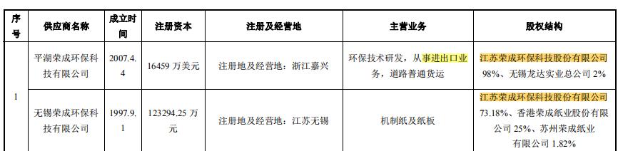 平湖荣成环保科技有限公司为台湾法人荣成纸业股份有限公司(其股票于1985 年在台湾证券交易所上市)控制的公司,主要产品为工业包装用牛皮纸和瓦楞原纸,此外,荣成纸业股份有限公司还控制了无锡荣成环保科技有限公司,也是森林包装竞争对手之一。